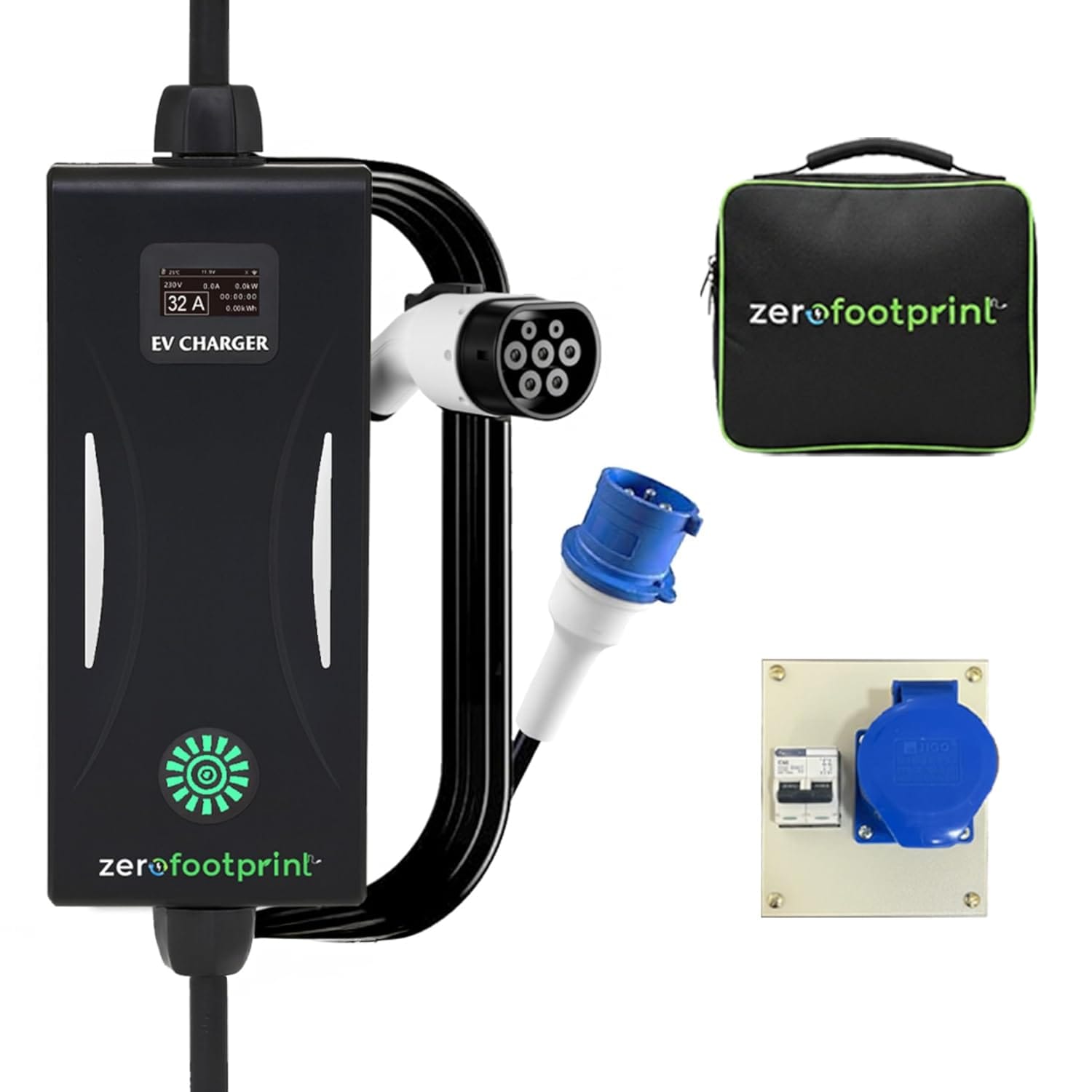 ZeroFootprint 7.4 kW Portable EV Charger Bundle for Cars (Charger + MCB & SocketBox) | 5m Cable | LCD Display | Adjustable Current, 32A (1 Phase) | IP67 | All Protectioons | 5 Year Warranty*
